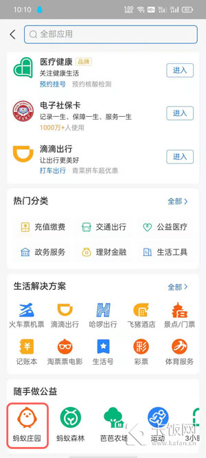 2、如果没有可通过【全部】,选择“随手做公益”下方的【蚂蚁庄园】进入;