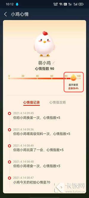 5、如果您的小鸡太久没有喂食,则会降低进食速度,可通过喂养、玩耍、换装等方法提升心情值,具体点击这里查看攻略。